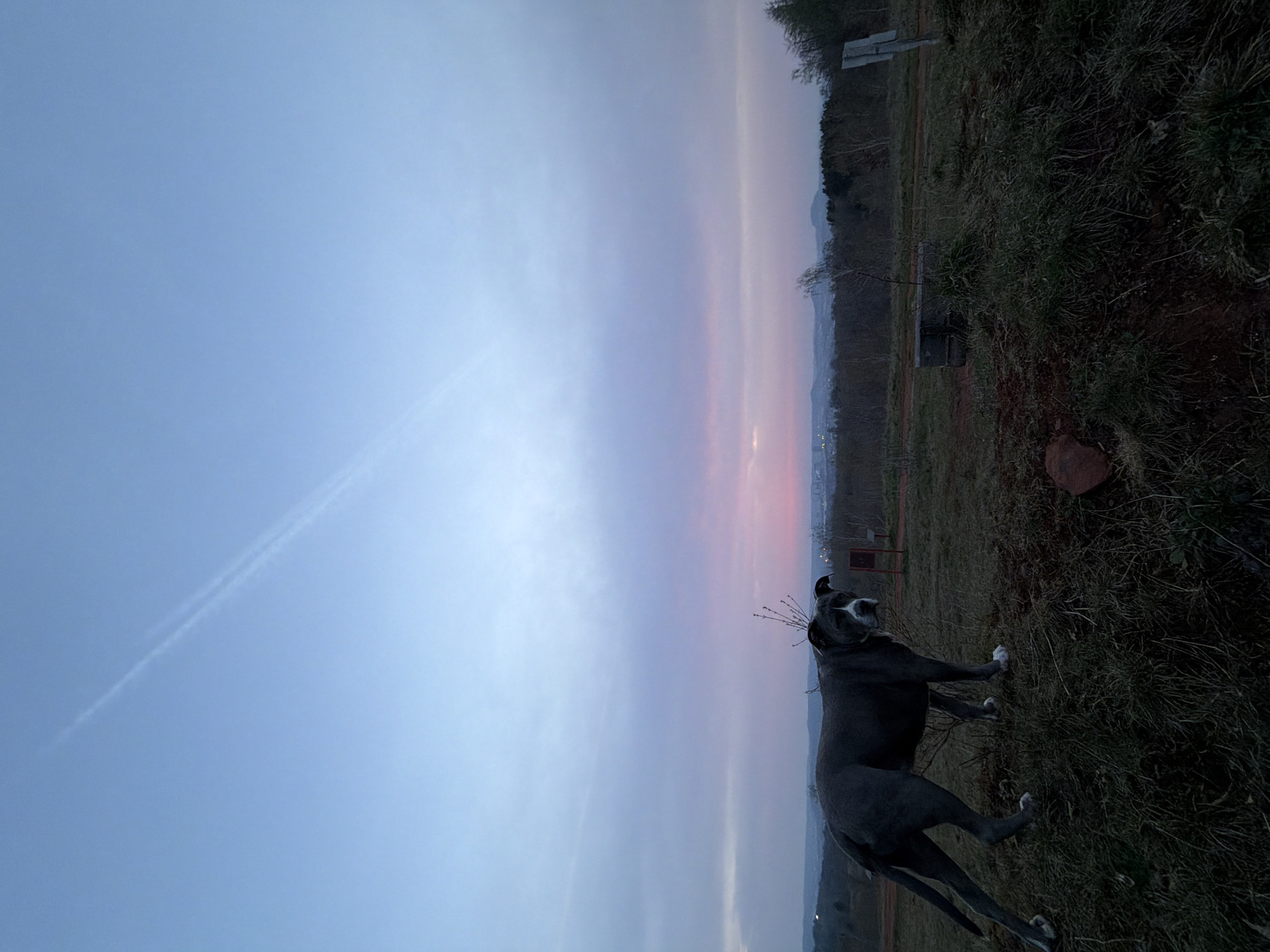 The image depicts an outdoor twilight scene, likely at dawn or dusk, in Schifflange, Luxembourg. A large, muscular grey dog, possibly a Pitbull-type breed, with white markings on its muzzle, chest, and paws, stands in the foreground, looking directly at the viewer. The dog is positioned on a slightly elevated area of sparse green grass and reddish-brown soil. Behind the dog, to the right, a small red structure, resembling an informational sign, is visible. Further to the right, a dark, rectangular container or bench-like object sits on a dirt path, with a white signpost to its far right. Bare tree branches and sparse vegetation are scattered across the midground. The horizon reveals a distant cityscape with faint lights on the left, silhouetted against a sky transitioning from pink at the horizon through purple to light blue overhead. A prominent white contrail streaks diagonally across the upper left portion of the blue sky. The overall environment appears to be an elevated, open area with a panoramic view of the surrounding natural landscape and distant urban elements.