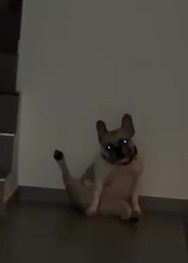 A short video shows a tan and white French bulldog sitting on the floor against a white wall. The dog is seated with its legs spread and one leg raised up slightly, as if it is licking itself. The dog has a red collar. The lighting in the room is dim. The floor is dark gray. There is a white ledge to the left of the dog. There is a voice speaking, but the content is not discernible.