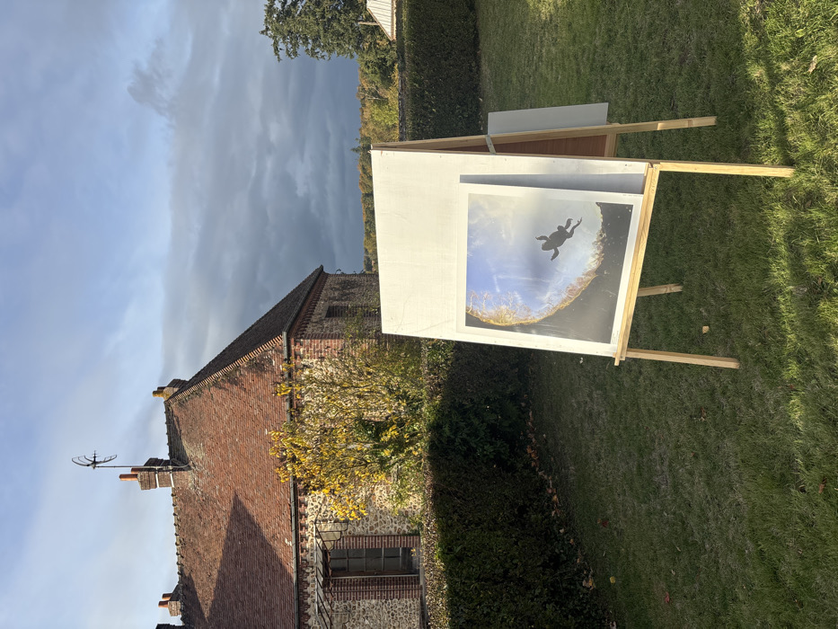 An outdoor scene in Mesnils-sur-Iton, France, depicts a photograph displayed on a wooden easel in a grassy area under a partially cloudy sky. The easel, positioned centrally in the frame, supports a large white board and, leaning against it, a square-format framed print. The print features a silhouette of a person in a free-falling posture against a bright, light blue sky, encircled by a halo of golden and white light, possibly representing sun rays through water or atmospheric phenomena. To the left and rear of the easel, a two-story building with stone and brick walls and a red tiled roof dominates the background. Multiple brick chimneys protrude from the roof, and an old, multi-pronged antenna is visible on the central chimney. A dark, possibly wooden-framed window with a small, ornate metal awning is present on the lower level of the building. A vibrant yellow-leafed tree is situated between the easel and the house. A neatly trimmed green hedge separates the grassy foreground from the background elements. The sky above the house and extending to the right features patches of clear blue, transitioning into darker gray clouds. In the far right background, a dense line of trees with varied green and autumnal foliage is visible, with a small portion of a light-colored roof structure appearing at the edge of the frame. The foreground lawn is evenly cut, with sparse fallen leaves visible, and strong shadows indicate direct sunlight from the left. No individuals are present in the immediate scene.