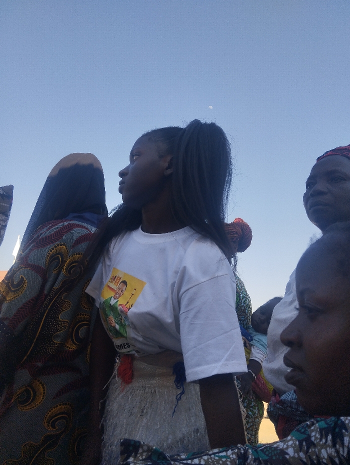 The image depicts an outdoor gathering in Idon, Nigeria, under a clear blue daytime sky with a visible crescent moon. A young Black female occupies the center-left, shown in profile facing left. She wears a white short-sleeved t-shirt featuring a campaign image of a smiling man in a green suit, with text below. Her lower garment is a light-colored, possibly fringed or layered skirt, adorned with red and blue tassels at the waist. Her dark hair is styled in two ponytails. To her immediate left, the partial back and side of an individual wearing a dark head covering and a patterned blue-and-yellow fabric garment are visible. To the right and slightly behind the central figure, the profile of an older Black female is seen, also looking left, wearing a patterned headscarf. In the lower right foreground, a young Black child's partial face and patterned clothing are visible, directed left. Further in the background on the right, another individual is partially visible, appearing to carry an infant in a patterned sling or wrap. All visible subjects appear to be observing something off-frame to the left.