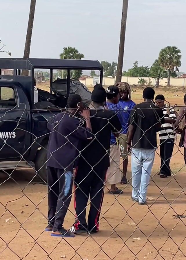 group of about ten people standing together on a dirt field, with a dark blue pickup truck nearby. The view is partially obstructed by a chain-link fence. Most of the people appear to be young men, wearing casual clothing such as jeans, t-shirts, and tracksuits. One man is wearing a blue and white checkered shirt, and another has on a brown fur hat. At one point, two of the individuals seem to briefly shove each other. The pickup truck has the word "WAYS" printed on the side, and a phone number is visible above it. There are palm trees scattered around the area, and buildings can be seen in the distance. The sky is overcast.