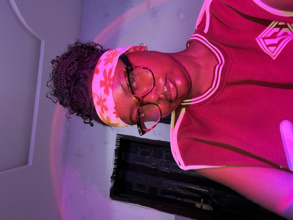 A young individual with dark skin wears a floral headband and clear glasses, framed by small, curly braids. They're dressed in a red t-shirt with white trim. The setting appears to be indoors, bathed in a purple light that creates a vibrant, almost surreal atmosphere. A dark, framed object is visible in the background, contributing to the room's ambiance. The photograph is taken from a slightly tilted perspective.
