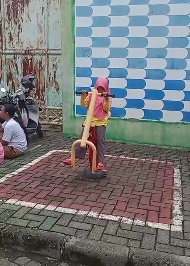 young girl wearing a pink hijab, yellow shirt, and gray pants standing on a red and gray playground pump. She is holding onto the handlebars and pumping her legs to move the device up and down. To her left, a man and a young child are sitting on the ground, and a motorcycle is parked nearby. Behind her is a wall painted with a blue and white pattern, and a rusty metal fence. The ground is paved with red and gray bricks.