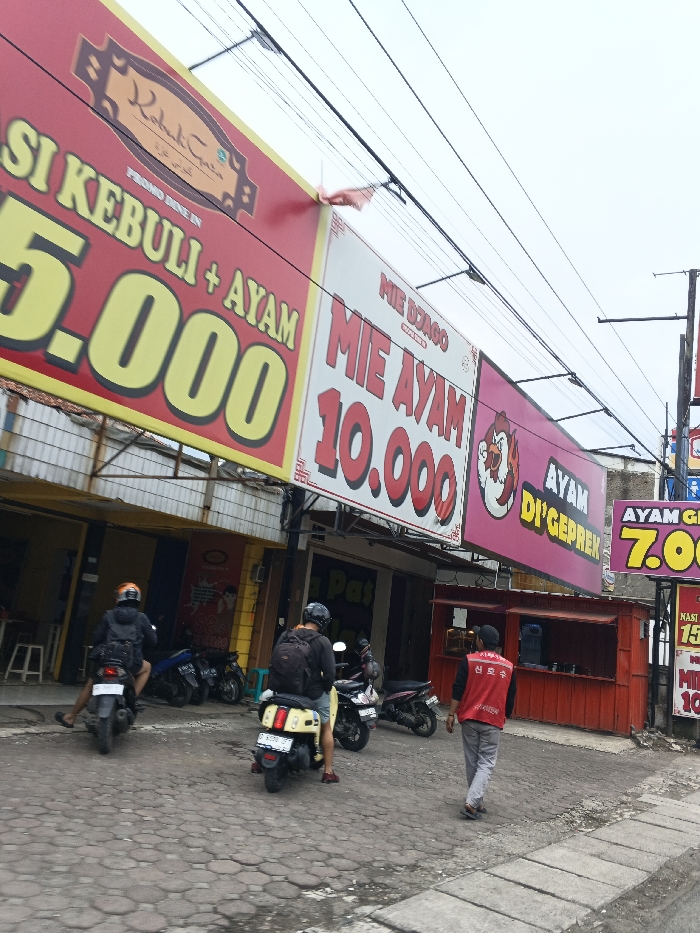 An outdoor scene displays street-side food advertisements with visible prices. Banners advertise "SI KEBULI + AYAM" for 5,000, "MIE AYAM" for 10,000, and "AYAM DI'GEPREK" for 7.00. A person in a red vest walks on the street. Two people on motorcycles are present. The scene has typical Asian street architecture. The text in the image is a mix of Indonesian and Korean. The overall impression is of a bustling street food area.
