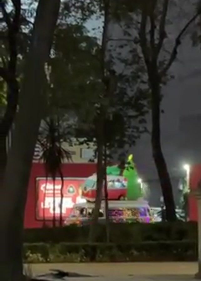 n outdoor scene at night. The view is partially obstructed by trees in the foreground. Behind the trees, a red building is visible, with a large advertisement featuring people displayed on it. In front of the building, there are decorative light displays. These include multiple small buses decorated with Christmas lights, topped with Santa Claus figures and Christmas trees. A road and sidewalk are in the immediate foreground, with a curb separating them. Streetlights are visible in the background, and the sky is dark and overcast.