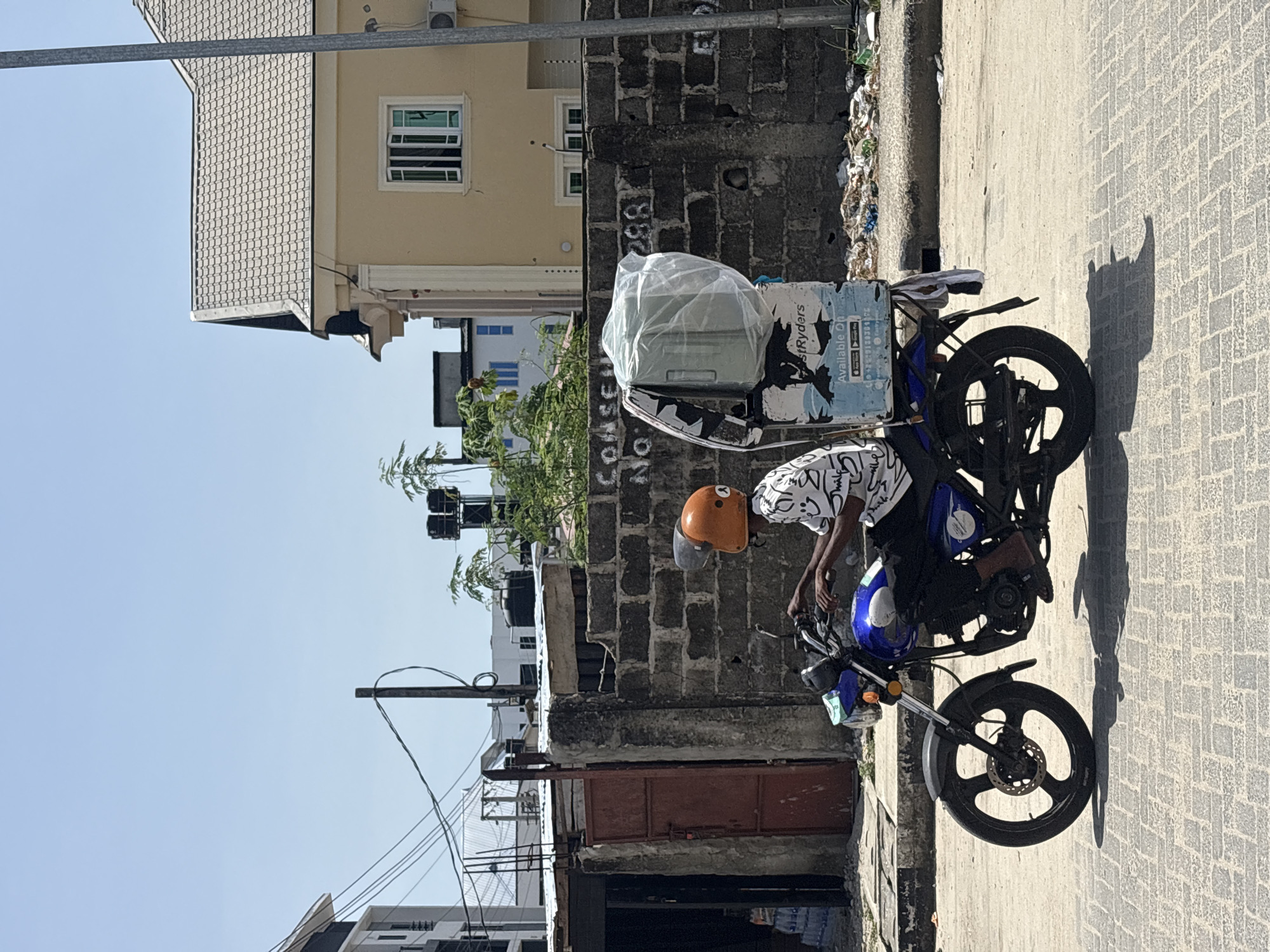 A motorcycle delivery driver is seated on his parked blue motorcycle in Igboefon, Nigeria