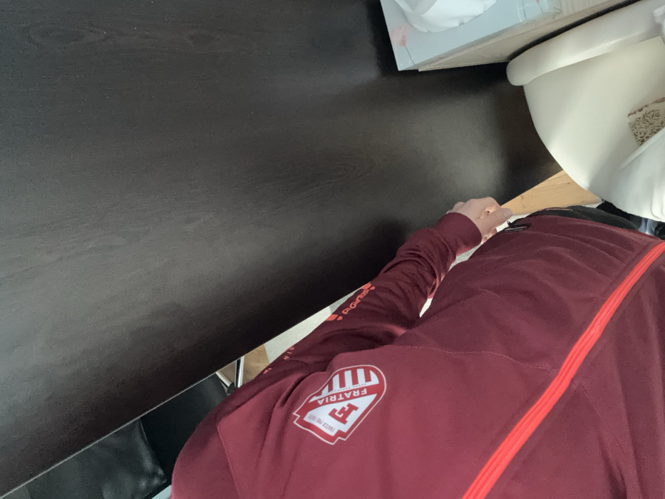 The image depicts an indoor scene in Varna, Bulgaria, featuring one individual. The person is viewed from the side-rear, wearing a maroon full-zip athletic jacket. A white and red crest-shaped emblem on the right bicep displays "FRATRIA" and "FORZA PRO BG". The left sleeve exhibits red horizontal stripes and the text "DigiTus". A red zipper runs along the left side of the jacket. The individual's right hand is visible, positioned near a light wooden surface or object. The background consists of a dark brown, possibly wooden, wall or furniture panel. In the lower right, a cream-colored armchair supports a small, textured, light-colored item. Adjacent to the armchair, a light grey surface displays a red smudge and a partially visible white tissue box. Portions of a light wood-toned floor and dark furniture are discernible in the upper left background.