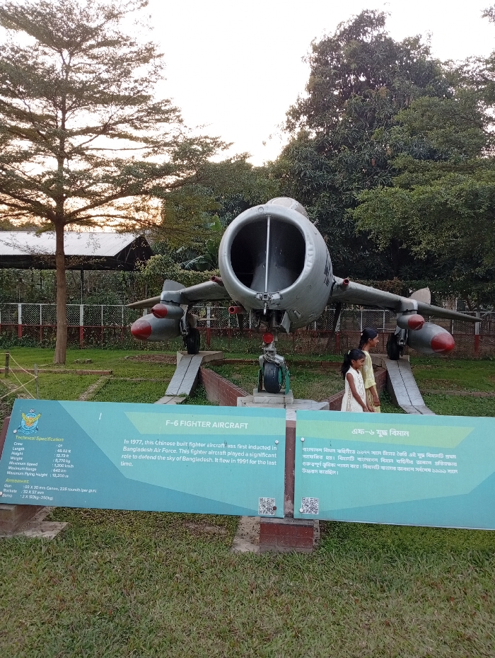 The image depicts an outdoor static display of a grey F-6 fighter aircraft at the Bangladesh Air Force Museum in Dhaka, Bangladesh