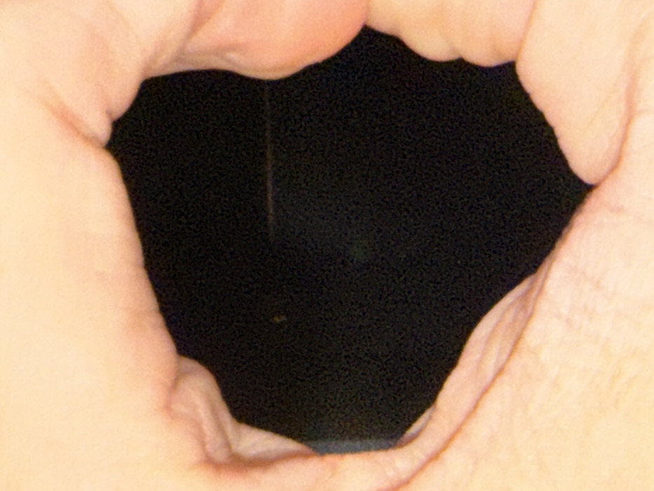 The image displays a close-up view of two light-skinned human hands, positioned in the foreground to create an irregular, roughly heart-shaped opening. This aperture frames a deep black, uniformly dark, and largely featureless central area. Within the darkness, faint pixelation and a subtle, thin horizontal line are barely discernible near the center-right. The hands show skin texture and natural creases. No specific objects, discernible subjects, actions, interactions beyond the framing by the hands, or environmental details are identifiable within the dark void or the immediate periphery that would indicate a location in the city of Yablonovskiy, Russia. The scene exclusively depicts the hands and the dark space they enclose.
