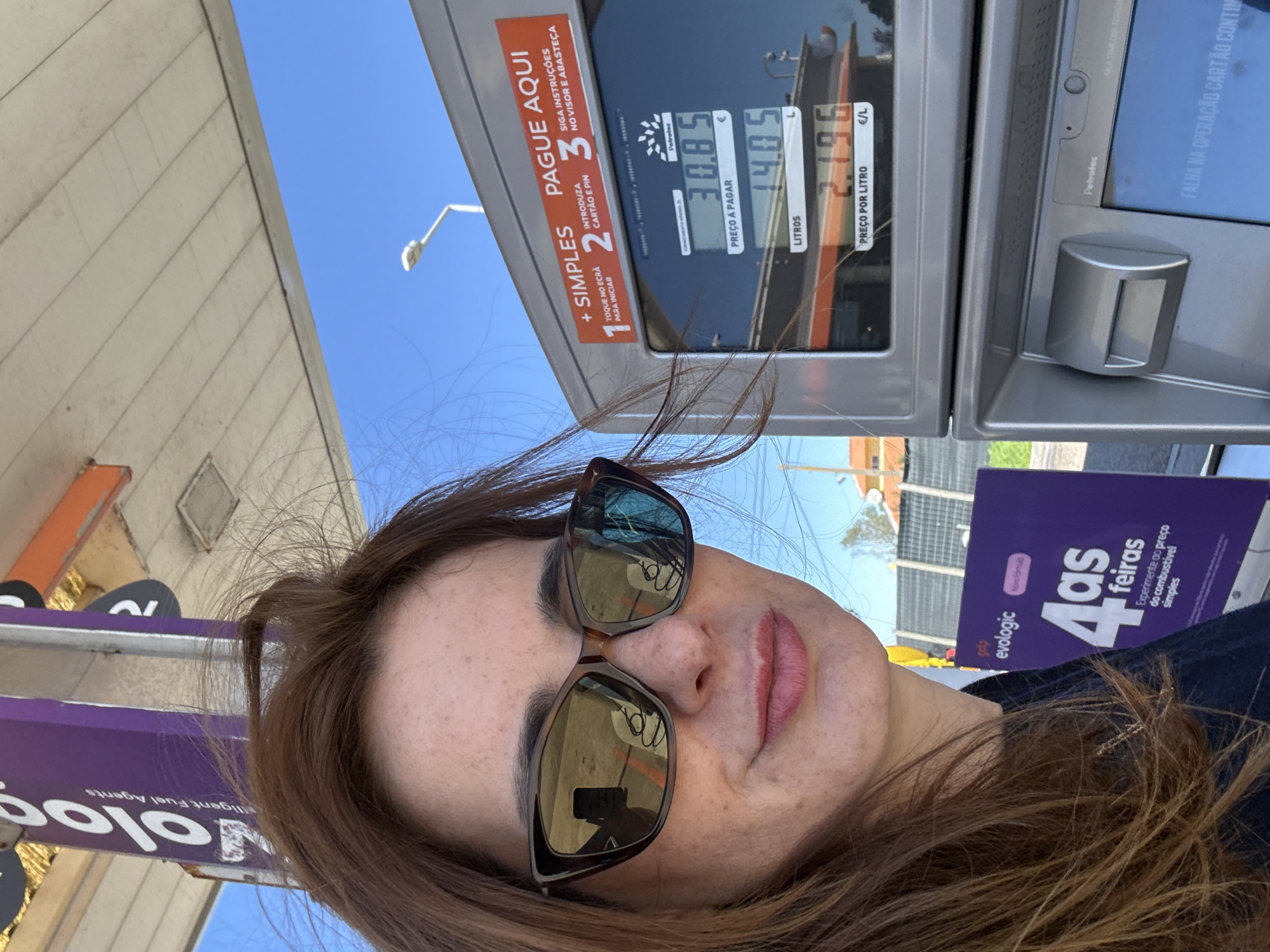 A female individual with reddish-brown hair and freckles on her face is partially visible, positioned in front of a fuel dispenser at a gas station in Alcochete, Portugal