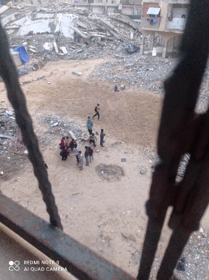 The image captures an elevated view of an open, sandy ground area in Khan Yunis, Palestinian Territory, observed through a dark, metallic railing partially obscuring the immediate foreground. The background is dominated by severely damaged and collapsed multi-story buildings, exhibiting extensive piles of concrete rubble, shattered structures, and exposed rebar, particularly on the left side. Some less damaged building facades are visible further in the background. A blue tarp is draped over a debris pile on the left, while laundry is visible hanging on a balcony of a relatively intact building on the right. On the light brown sandy ground, approximately 10-12 individuals, primarily children, are present. A central group of 8-10 children is clustered in the mid-ground, appearing to interact, with one child in a light-colored top extending an arm towards the group. To their immediate right, a child in a dark top stands apart. Further back, two children are walking across the sandy expanse; one wears a light green jacket, and the other is in a dark top. In the far right background, a solitary child in a blue top is seated directly on the ground. The ground surface consists of sand interspersed with scattered small rocks and debris.