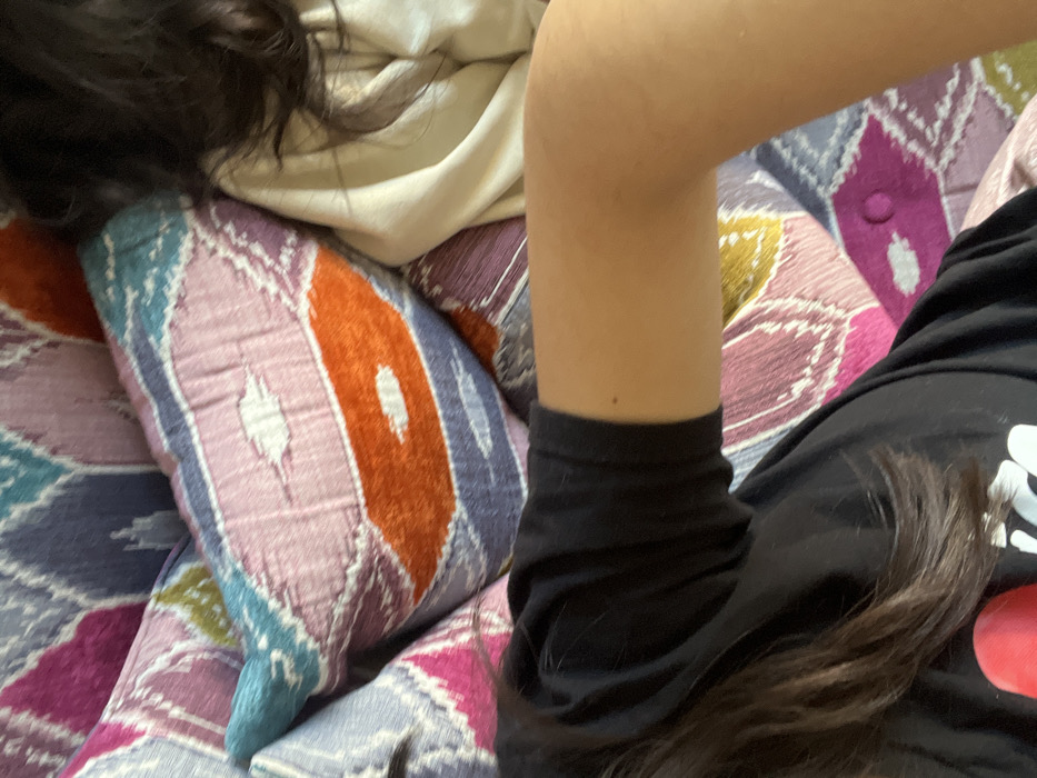 The scene is located in Tlaxcalancingo, Mexico. An indoor setting features multiple decorative pillows with an ikat-like or chevron pattern in shades of purple, pink, teal, orange, and grey. Two individuals are partially visible. In the foreground, lower left, a person with dark brown hair is seen, wearing a black short-sleeved shirt with a red object and white text partially visible on the chest area. Their light-skinned right arm is bent at the elbow, extending towards the right side of the frame. In the upper right, the head and upper body of a second individual are visible, characterized by dark brown, wavy hair and a light-colored (beige/off-white) garment covering their body. Both individuals appear to be resting or reclining amongst the pillows.