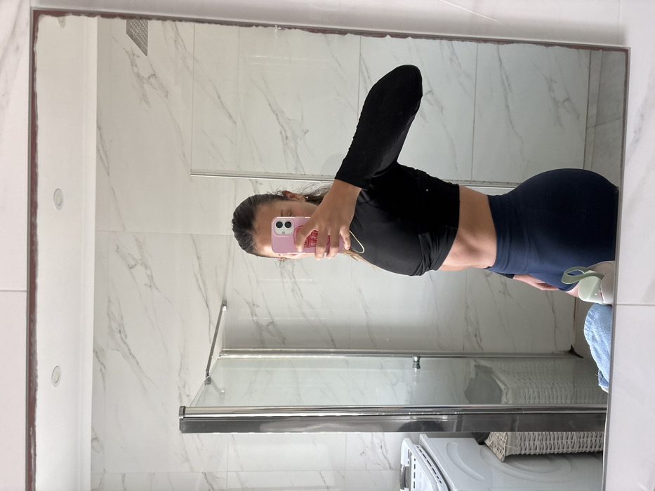 A female individual is depicted taking a mirror selfie in a modern bathroom, located in Rishon LeZion, Israel. The subject, with dark hair pulled back, is partially obscured by a pink-cased smartphone held to her face. She wears a black long-sleeved cropped top, exposing her midriff, and dark blue form-fitting shorts or leggings. A thin gold necklace is visible. The bathroom features white marble-patterned wall tiles and a white ceiling with two recessed spotlights. Reflected in the mirror to the left is a glass shower enclosure with metal framing, and a white washing machine beside a woven laundry hamper. A light blue towel is visible on the floor in the lower left. A square rain showerhead is reflected on the tiled wall behind the subject's right side.