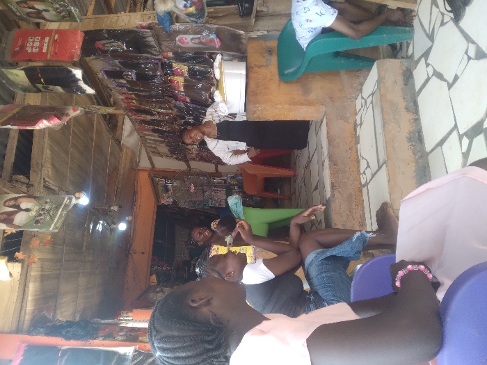 This image depicts a semi-enclosed beauty supply stall or salon in Agege, Nigeria