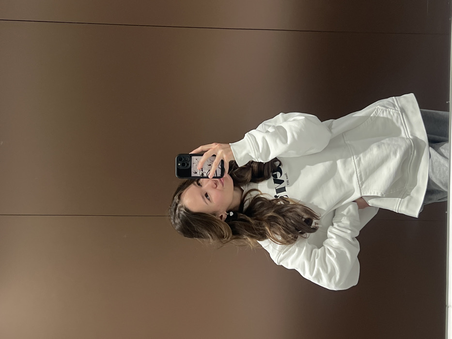 A young woman in a white hoodie and gray pants takes a mirror selfie. She holds a phone in her right hand, its case decorated with designs. Her long, brown hair cascades over her shoulder. The background is a plain brown wall. The image is rotated sideways.
