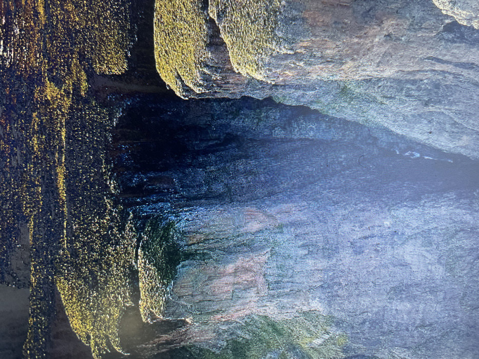 A close-up reveals layered rock formations. The upper portions are tinged with golden-green moss or lichen. Below, a dark, shadowy recess suggests a cave-like opening. The lower rock face is primarily gray-blue, displaying textured patterns reminiscent of sedimentary layers. Patches of green vegetation are sporadically visible. The image's overall tone is rugged and textural, emphasizing the natural weathering and composition of the rock.