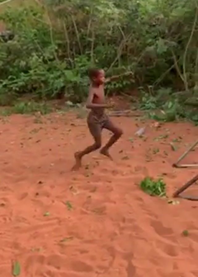 two young, dark-skinned boys on a sandy, reddish-orange ground with trees and shrubs in the background. One boy, shirtless and wearing dark shorts, runs towards a small, low, brown wooden hurdle. He jumps over it, extending his arms and legs in a hurdle-jumping motion. Another boy stands to the side, partially visible in the frame. The area appears to be an outdoor space, possibly a backyard or a playground area. There are what appear to be building or house roofs in the background.