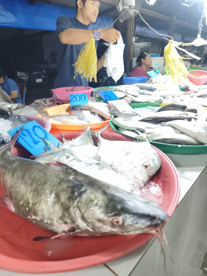 The scene depicts a fish market stall in Baan Mae Nam, Thailand