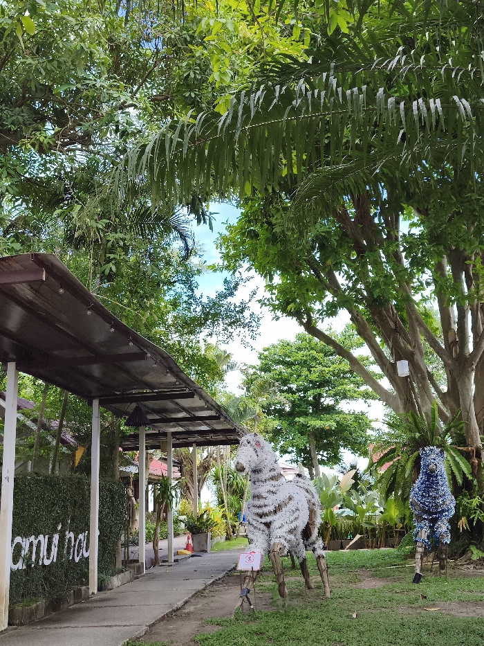 A vibrant outdoor scene shows a pathway alongside a building with a covered awning. A lush green hedge displaying "amui hou" borders the walkway. On the right, a whimsical horse sculpture, crafted from white and silver tinsel, stands on a grassy area near a blue tinsel sculpture. Trees with abundant green foliage provide shade, and a glimpse of the sky peeks through.