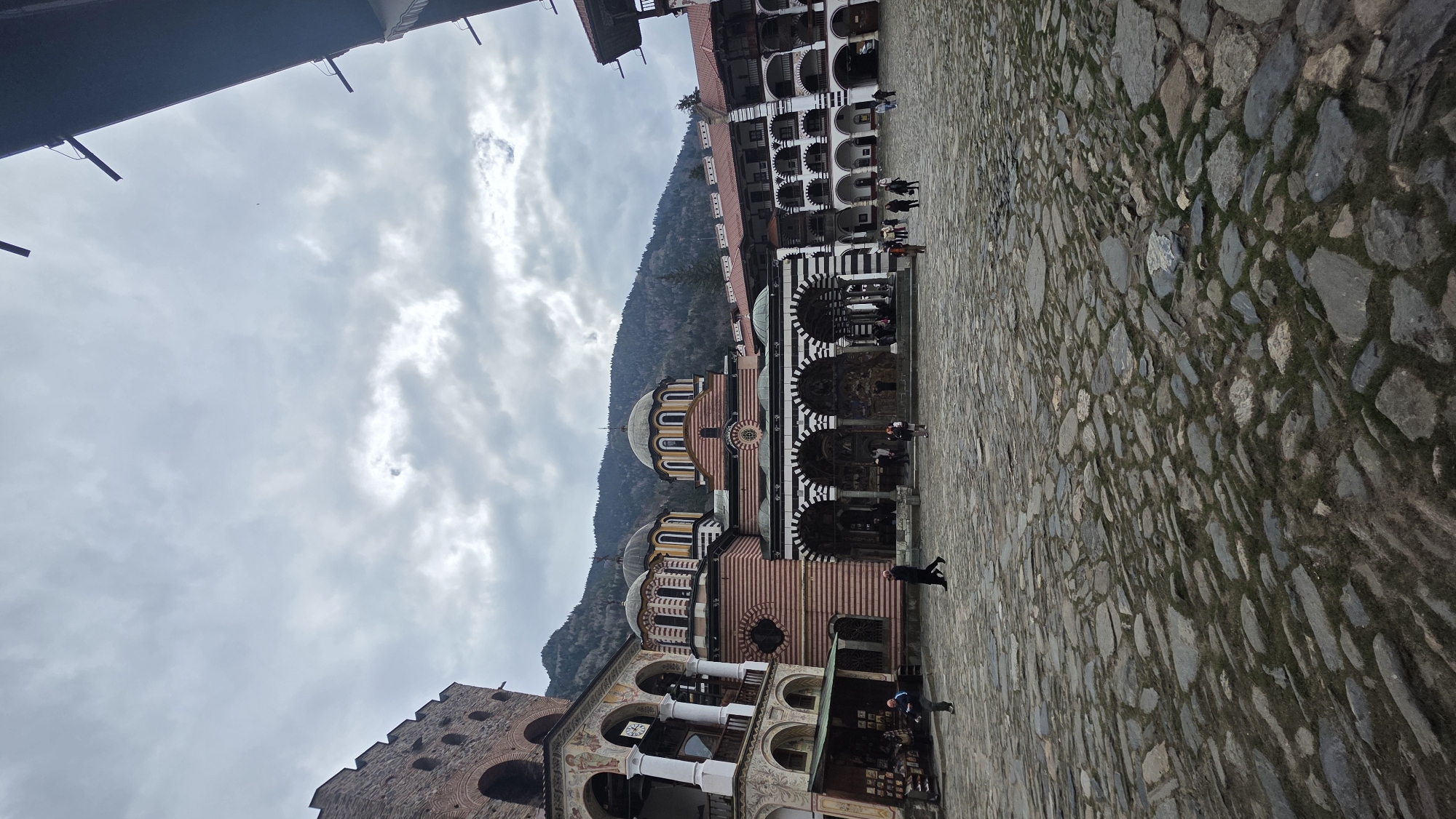 The image depicts the central courtyard of the Rila Monastery in Rilski Manastir, Bulgaria. The ground is paved with irregular grey stone slabs, with patches of green moss or grass growing between them. The central structure is the main church, exhibiting horizontal red and white striped walls and five domes with alternating yellow and black vertical stripes. Its main entrance features a portico with black and white striped arches, adorned with extensive frescoes and religious iconography. To the left of the church, a multi-story monastic wing with a prominent stone tower rises, featuring crenellated battlements, arched windows, painted facades, and lower-level arcades. A commercial stall with displayed items is visible beneath an archway on the ground floor of this wing. To the right, another multi-story monastic wing extends, characterized by white facades, dark wooden balconies, and a red tiled roof. In the background, steep, densely forested mountain slopes rise under an overcast grey sky with visible cloud formations. Approximately 15-20 individuals are present, distributed across the stone courtyard and near the church entrance, engaged in walking and observation. No specific interactions are clearly discernible.