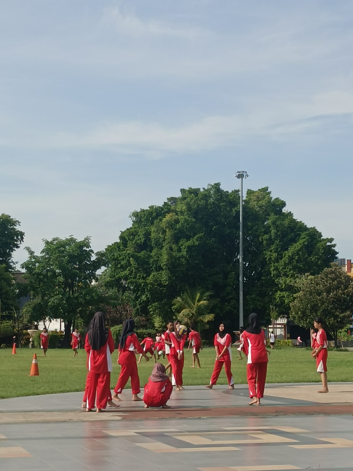 This image depicts an outdoor daytime scene in Kecamatan Pati, Indonesia, within a public recreational area featuring both paved and grassy zones. Approximately 15 to 20 young individuals, predominantly females, are visible. In the foreground, a geometrically patterned paved surface is present, where one person, dressed in a red and white tracksuit and a light brown hijab, is kneeling. The midground consists of a manicured green lawn, where the majority of participants are located. All individuals are wearing matching red and white tracksuits; many females also wear dark-colored hijabs. One individual near the center-right is holding a volleyball, suggesting a group game or exercise. Several orange traffic cones are sparsely arranged on the grass. Participants are observed in various postures, including standing, moving, and athletic stances. The background features a dense line of mature green trees, some partially obscuring distant structures. A tall floodlight pole with multiple lamps rises prominently above the treeline towards the right. The sky overhead is clear blue with sparse, wispy white cloud formations.