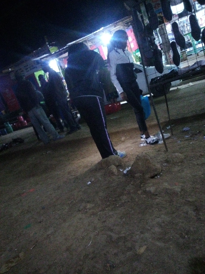 The image depicts an outdoor night scene in the City of Unknown, Unknown, characterized by artificial lighting from market stalls. The ground is unpaved earth, strewn with rocks and scattered debris, including white and colored fragments. Approximately five individuals are visible, primarily from the back or side. In the mid-foreground, a person wearing a dark jacket with a white stripe on the arm and dark pants with a side stripe stands, their back partially to the viewer, facing left. To their right, a second person, seen in side profile, wears a white and dark colored jacket, dark pants, and white athletic shoes with black accents; they hold a light blue object, possibly a bag, in their left hand and face towards the right. Their dark hair is visible. In the background, multiple figures are present near brightly illuminated market stalls with corrugated metal roofs. One figure in the left background wears light grey pants and a dark top. Adjacent to these figures, red containers, possibly gas cylinders, are stacked. To the right, a white vehicle is partially visible behind the second prominent person. A metal display rack, likely part of a vendor's stall, stands on the right, exhibiting multiple dark-colored shoes or sandals hanging from wires. The scene is illuminated by strong overhead lights, creating bright glare and deep shadows. No direct interactions between the visible individuals are clearly discernible; they appear to be standing within the illuminated area of a marketplace.