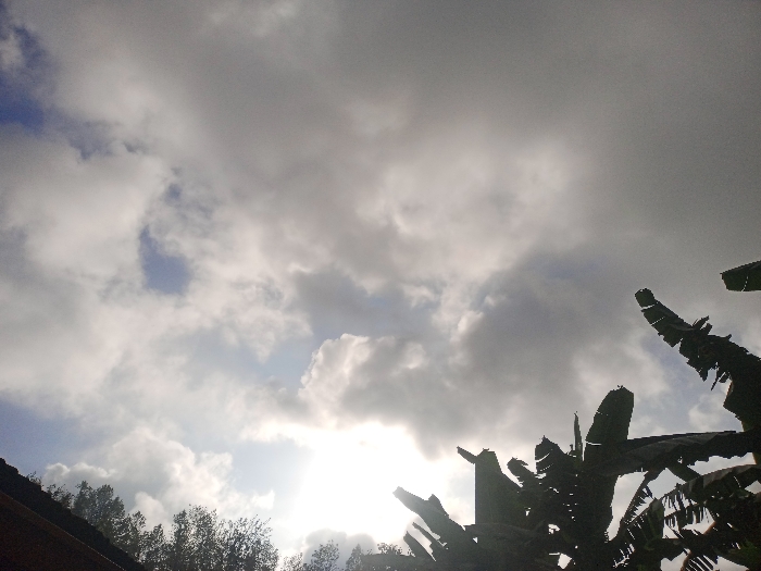 An upward perspective reveals a sky dominated by thick, gray clouds, partially obscuring the sun. Patches of blue sky peek through the cloud cover in the upper left. Silhouetted against the bright sunlight are the dark, spiky leaves of banana trees in the lower right. Below the trees, the tops of other trees and a building roof are visible.