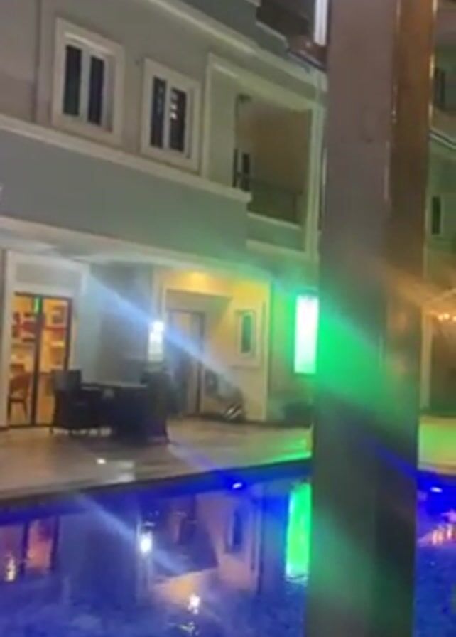 multi-story building with a pool in front of it, likely at night. The building has a light gray facade and several windows. A few doors lead out to the patio area beside the pool. There's a table and chairs on the patio. The pool is lit with blue lights, and the reflection of the building can be seen in the water. Green lights are visible near the pool area as well. The camera is slightly obscured by a pole-like structure. The scene appears to be peaceful and serene.