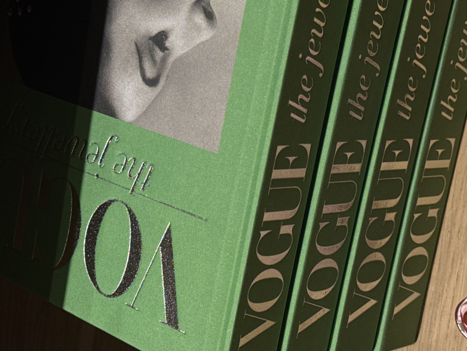 several green books titled "VOGUE the Jewellery". The books are stacked and angled, displaying their spines and a portion of the cover of the top book. The cover includes a black and white photograph of a person's face, focusing on the ear. The title "VOGUE" is printed in a sparkling silver font on the cover. A shadow falls across the leftmost book.