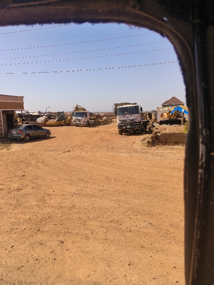 The image depicts an outdoor heavy equipment storage or work yard in Kwang, Nigeria, viewed from inside a vehicle