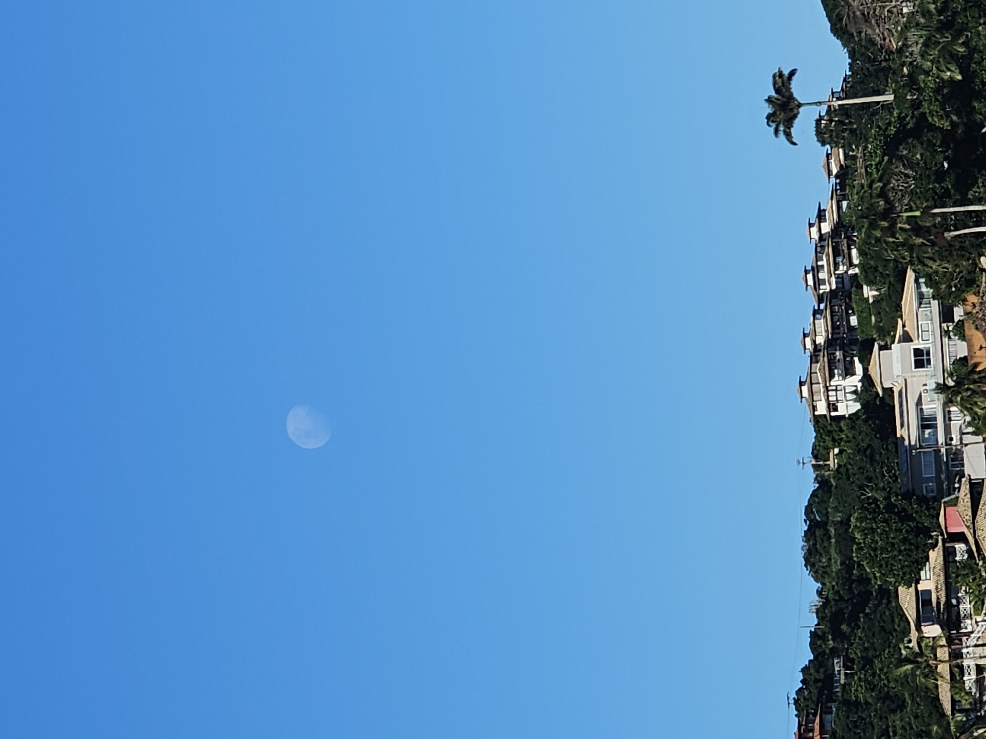 clear blue sky with a half moon visible on the left