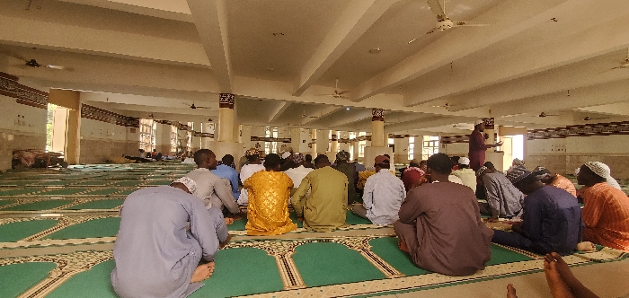 The image depicts a large group of approximately 40-50 adult males gathered inside a spacious hall, likely a mosque or prayer room, in a city of Unknown, Nigeria