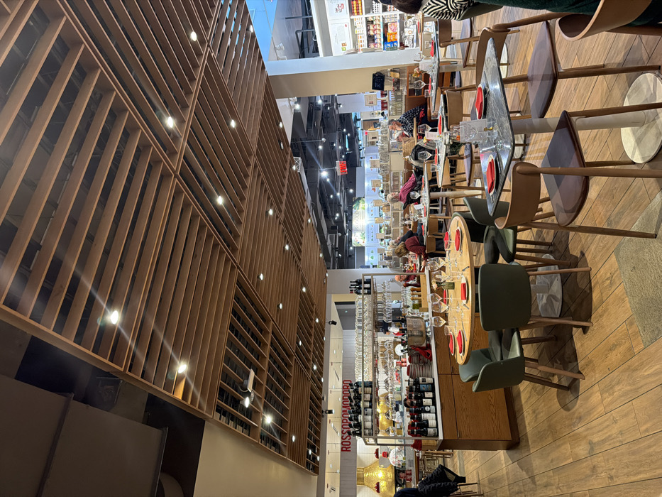 The photo shows an indoor restaurant setting. Dining tables with glasses and red placemats are neatly arranged on wooden flooring. The tables are surrounded by modern chairs in shades of green and beige. Along the walls, there is a display of wine bottles and glassware. The restaurant features a ceiling structure with an intricate geometric design of wood slats and integrated lights. The overall lighting is bright, creating a vibrant and upscale dining atmosphere.
