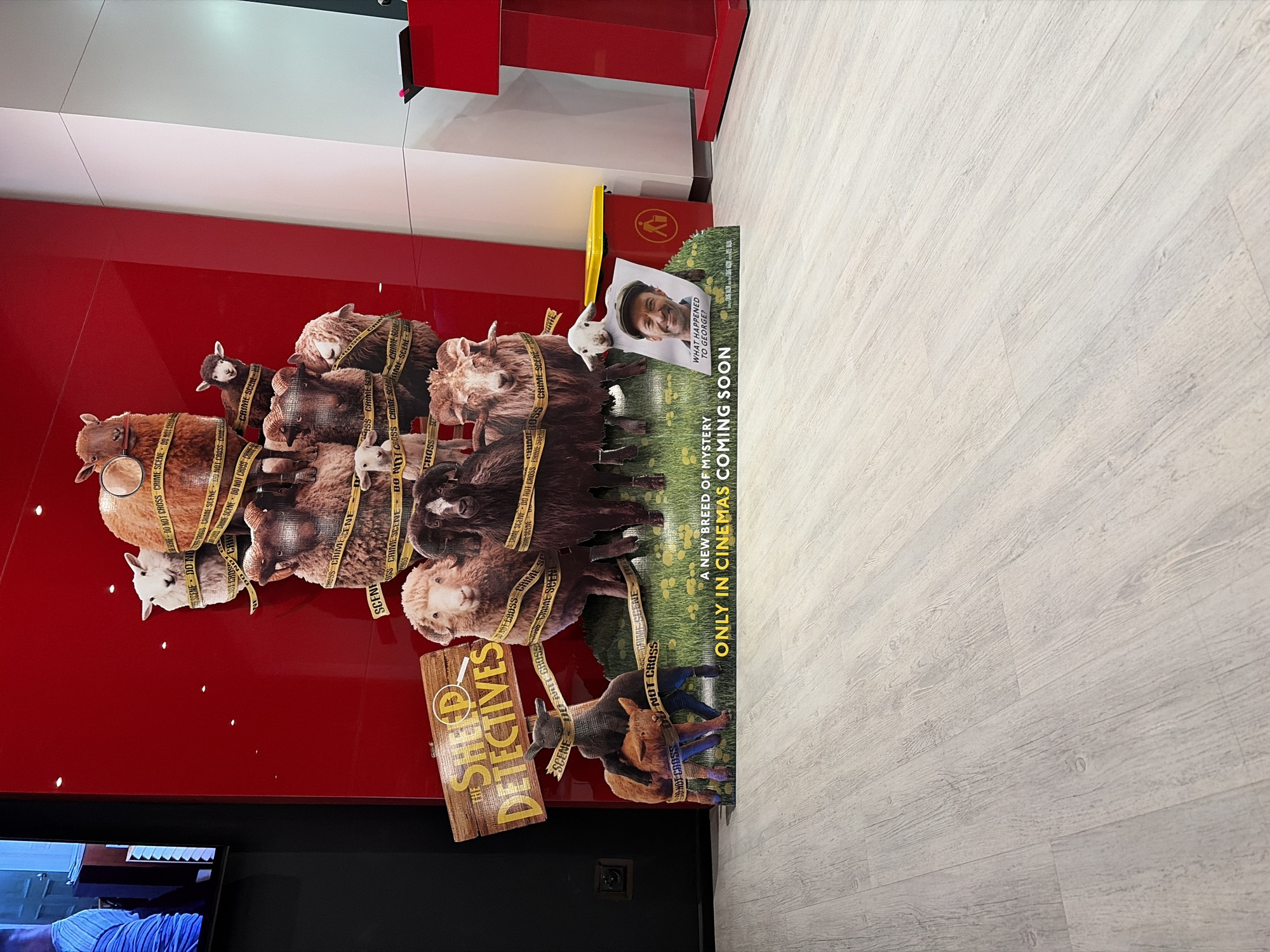 A promotional poster for the movie "The Sheep Detectives" is visible inside what appears to be a cinema in Sofia, Bulgaria. The poster features a stack of sheep wrapped in "Crime Scene - Do Not Cross" tape, with the movie title prominently displayed. A smaller image shows a man, and the tagline "What happened to George?". Text also promotes the film as "A new breed of mystery only in cinemas coming soon". The poster is positioned against a red wall with black accents and a light-colored, wood-look floor. A red waste bin is situated near the poster. A television screen is partially visible at the bottom left, displaying a blue image.