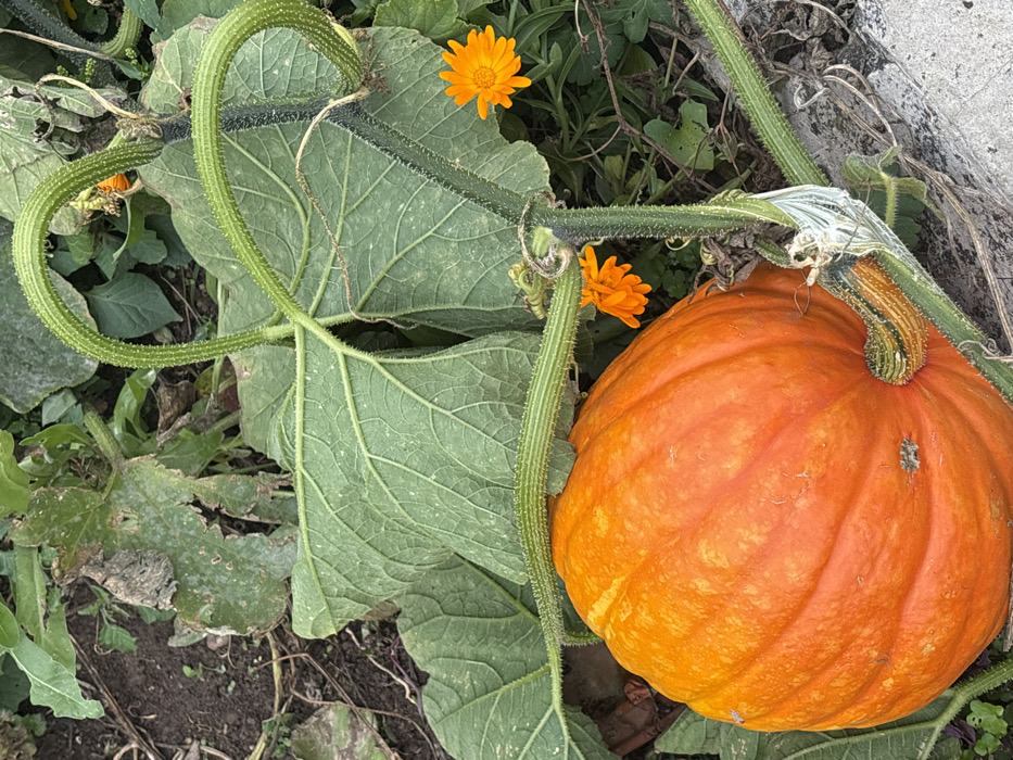 - "An overhead view depicts a large, round, ribbed orange pumpkin resting on dark soil within a cultivated area in Mesnils-sur-Iton, France" by FM-2VH5m1, licensed under CC BY 4.0