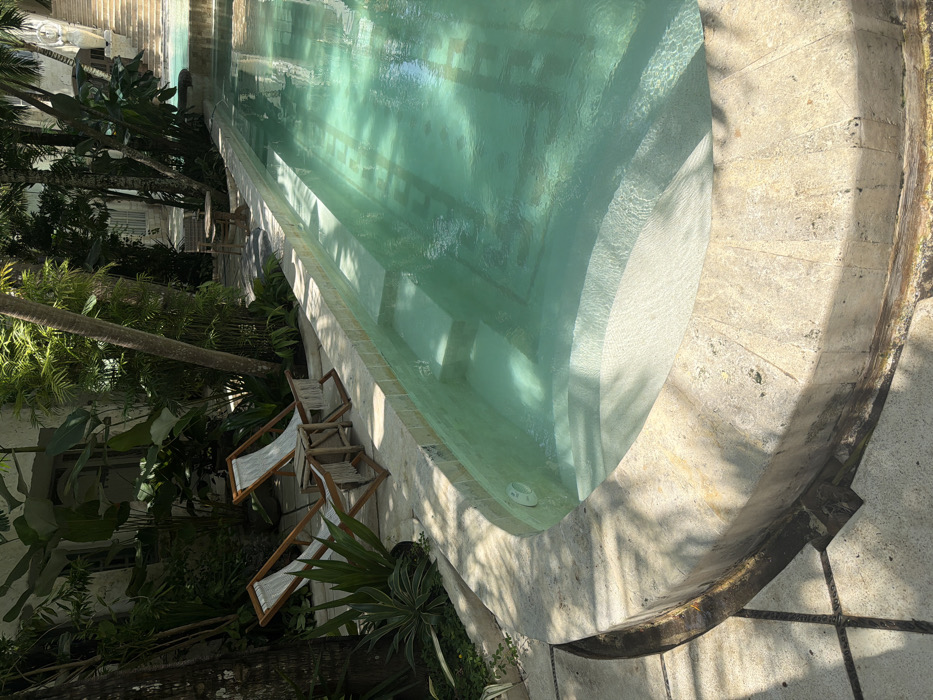 An outdoor swimming pool, located in Jimbaran, Indonesia, is depicted under bright daylight. The pool features clear, turquoise water with visible submerged steps at various depths, including a curved entry point in the foreground. The pool's edge is lined with light-colored, textured stone coping, showing minor signs of wear and algae in shadowed areas. Adjacent to the pool on the left are two empty wooden lounge chairs with light-colored, possibly fringed, fabric slings, positioned on a light-colored paved surface with patterned dark lines. A small wooden side table sits between the chairs. The immediate surroundings are characterized by lush, dense tropical vegetation, including palm trees and large-leafed plants, casting shadows across the paving and into the pool water. In the background, partially obscured by foliage, a white-colored building with windows is visible. To the right, beyond the pool, a flight of light-colored stone steps ascends, leading to what appears to be another water feature or a higher terrace. A single, dark-colored chair and a small round table are visible further down the pool's edge, partially hidden by greenery. No individuals are present, and no actions or interactions are occurring.