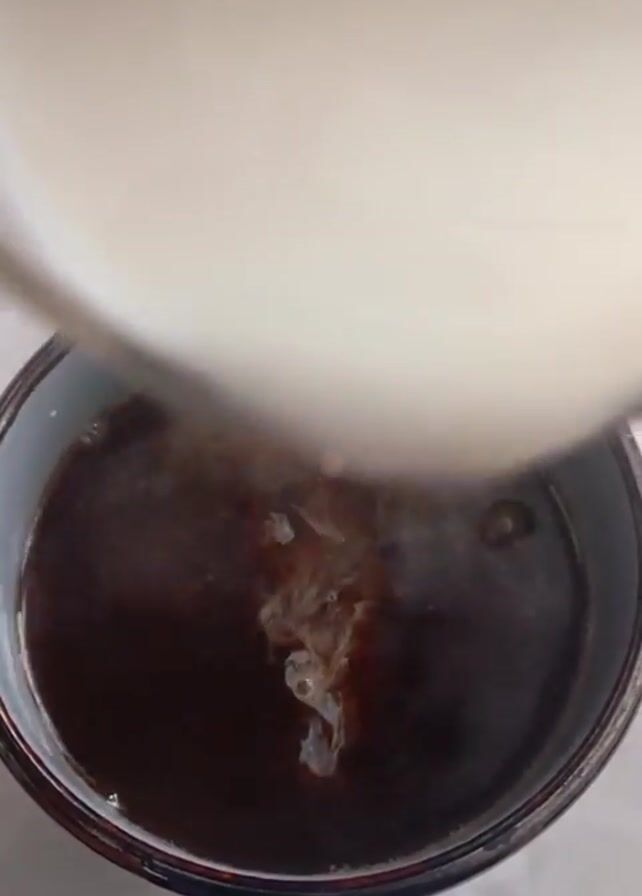 A close-up, top-down video shows someone pouring milk from a glass measuring cup into a metal bowl filled with dark coffee