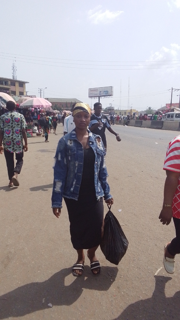 A woman stands in a street, wearing a black dress and a distressed denim jacket, holding a black plastic bag. Her head is wrapped in a gold and black patterned scarf. She is wearing striped sandals. A busy outdoor market with people, stalls, and buildings fills the background. A large billboard is visible in the distance. The street surface appears worn and dusty.