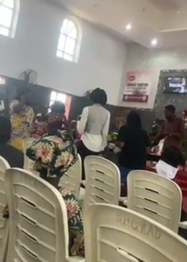The camera is inside what appears to be a church or large meeting hall, pointing towards a group of people gathered in the front