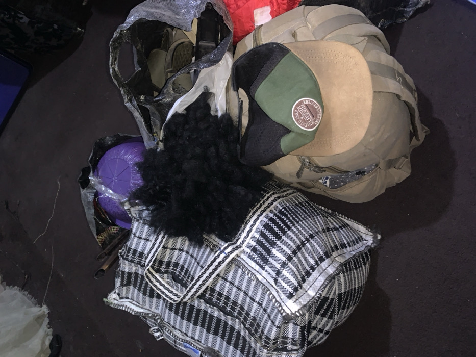 The image depicts a cluster of various personal effects and bags resting on a dark, uniform surface, likely an indoor floor, in an unidentified location within Jos, Nigeria