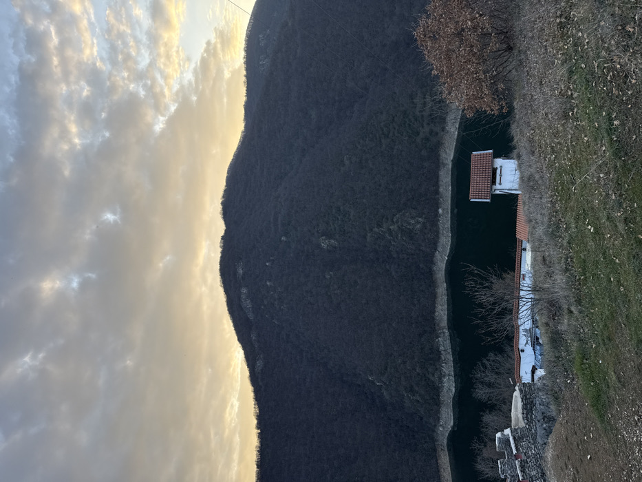 This image depicts a mountainous, rural landscape at what appears to be either sunrise or sunset, located in Unknown, Unknown