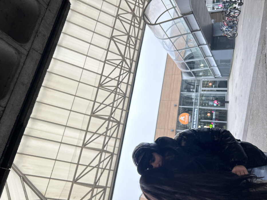 The image displays an outdoor scene at the Porte du Kochersberg area in Strasbourg, France. In the immediate foreground, two individuals are in an embrace. The individual on the right, facing left, wears a black puffer jacket, a black hooded sweatshirt, and a black baseball cap; their visible facial profile is oriented towards the other person. The second individual, on the left, has long, dark hair obscuring their face and most of their upper body; a light-colored garment is visible at the lower left. Their hands are clasped. In the midground, a modern building with a light brown upper facade and extensive glass windows is visible. A circular orange sign with a white "A" logo is prominently displayed on the building, accompanied by text that includes "Porte du Kochersberg." To the right of this building, an elevated, transparent, tunnel-like pedestrian walkway with a metal support structure slopes downwards. Below this walkway, several bicycles are parked in a rack. The ground surface is paved. Overhead, a large translucent corrugated roof structure, supported by a white metal truss framework, extends across the entire upper portion of the frame. The sky is overcast.