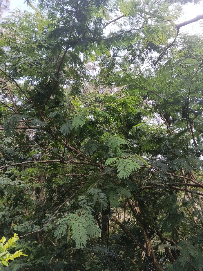 The image displays a dense, verdant canopy of trees and foliage, characteristic of a forested area in Baglung, Nepal. Multiple intertwined branches, predominantly brown, extend throughout the frame, supporting abundant green leaves that appear to be pinnately compound. Varying shades of green are present across the foliage, with some leaves showing lighter tones and others darker. Patches of a bright, light-colored sky are visible through gaps in the upper and middle sections of the canopy. In the lower left quadrant, lighter green leaves from a separate plant are discernible. Towards the lower right, darker, broader leaves, possibly from a palm or similar plant, are present among the tree trunks and branches. No human subjects, animals, or man-made objects are visible. The scene is illuminated by natural daylight.