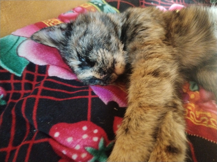 A tortoiseshell cat rests on a patterned blanket. The blanket is black with a red grid and features strawberries. The cat has a mix of black, gray, and brown fur on its head, and its body appears to be primarily brown with darker markings. The cat's eyes are closed as it lays with its paw extended.