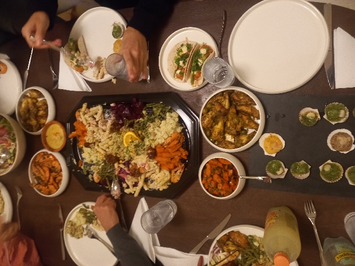 - "A table displays a variety of dishes: plates of pasta salad, tacos, and other foods" by FM-MtLfs2, licensed under CC BY 4.0