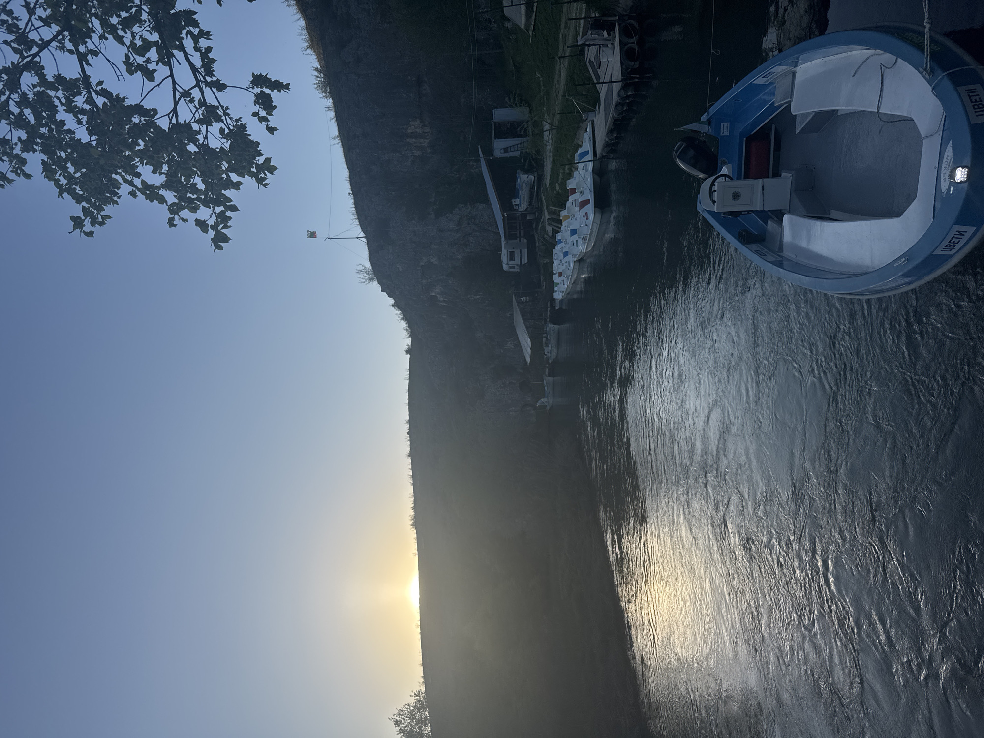 The image depicts a scene in the city of Lukovit, Bulgaria, showing a river landscape. On the right side of the frame, a blue and white motorboat is moored. Several small boats are docked in the mid-ground along the riverbank. The sun is setting over the rocky terrain on the left, creating a glare in the image. A tree branch is visible in the upper left corner. The river reflects the sunlight, producing a shimmering effect on the water's surface.