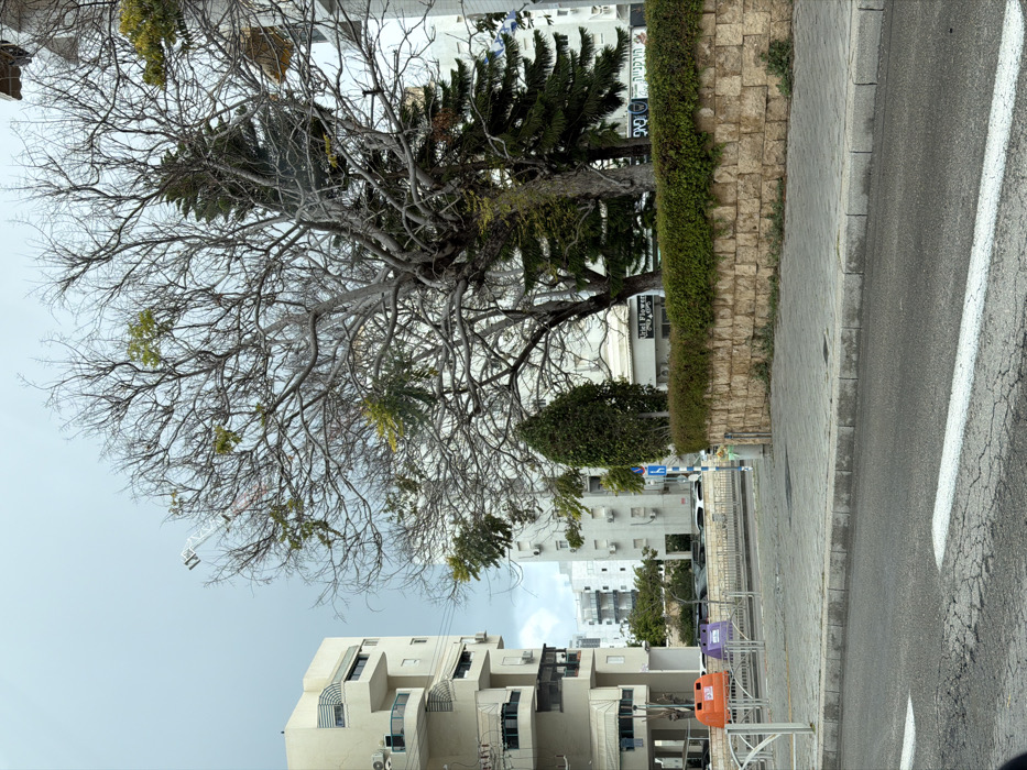 The image displays an urban street scene in Ashdod, Israel, viewed under an overcast sky. In the immediate foreground, a cracked asphalt road with a white broken line indicating a crosswalk is visible, bordered by a grey concrete curb. To the left on the sidewalk, three municipal recycling bins (orange, purple, and grey) are positioned behind a white metal barrier. A blue street sign, displaying a pedestrian symbol, stands nearby. The sidewalk is paved with grey interlocking bricks. To the right of the sidewalk, a low stone wall, constructed from light-colored blocks, is topped with a dense green hedge. Behind this hedge, several trees are present: a large, multi-trunked deciduous tree with predominantly bare, grey branches and some sparse green foliage centrally located, flanked by two dark green coniferous trees to its right and a slender, tall evergreen tree to its left. In the mid-ground on the left, a multi-story residential building with a light-colored facade, featuring distinctive curved balconies and external air conditioning units, rises prominently. In the background on the right, other multi-story, light-colored buildings are visible behind the trees and hedge, one displaying Hebrew business signage including "Uriel Flowers" and "The Greengrocer." A white construction crane is partially visible against the sky in the upper left quadrant of the frame. No individuals are depicted in the scene.