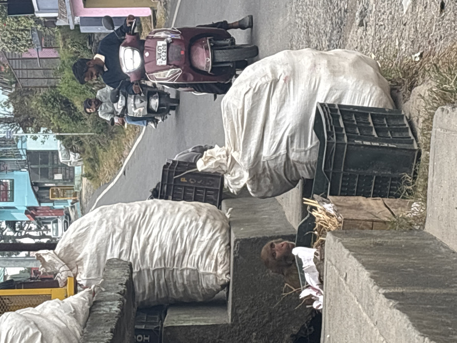 The image depicts a roadside scene in Kasar Devi, India. In the foreground, a multi-tiered concrete structure partially obscures the view. Stacked on and around this structure are several large, white, irregularly shaped sacks, likely filled with material. A black plastic crate is visible to the right of the concrete structure, and another partially obscured crate is directly to its left. Nestled beneath the concrete structure on the left, a brown-furred monkey with a reddish face is partially visible, peeking from behind some debris, including straw and white paper. An asphalt road ascends diagonally from the mid-ground to the left background. Three individuals are observed on two scooters on this road. The closest individual, driving a maroon-colored scooter with the license plate "UK01 CG208," is a male wearing a dark blue long-sleeved shirt and dark pants. He has a beard and is looking slightly to his right with a slight smile. His hands are on the handlebars. Behind him, a second male is operating a silver scooter, wearing a light-colored long-sleeved shirt, also looking forward. A third individual is riding as a passenger on the back of the silver scooter, largely obscured. The background features additional buildings with varying colors, including blue and pink, bordering the uphill road. Dense green vegetation and trees are visible on the slopes behind the buildings. A white car is parked further up the road on the left. The overall scene appears to be an active, semi-urban environment in a hilly region.