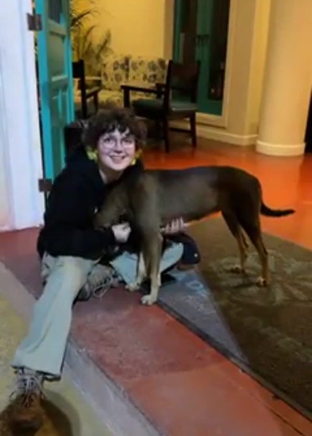 A person with short curly hair, wearing glasses, a black hoodie, and khaki pants, is sitting on a red-painted ledge, petting a medium-sized, short-haired brown dog. The person is smiling. The dog is standing, leaning into the person’s touch. They appear to be on a porch. Behind them are open turquoise double doors, a potted palm, and some dark wood chairs with patterned cushions inside a room with red floors. A doormat with text on it lies partially in front of the ledge. The scene is indoors and well-lit.