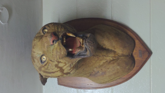 - "A taxidermied lion head is mounted on a varnished wooden plaque" by FM-QrecA3, licensed under CC BY 4.0